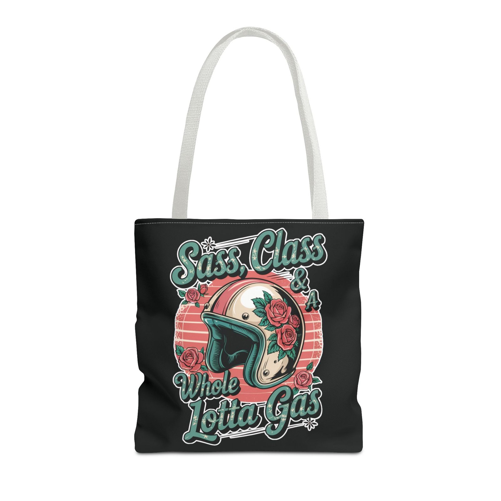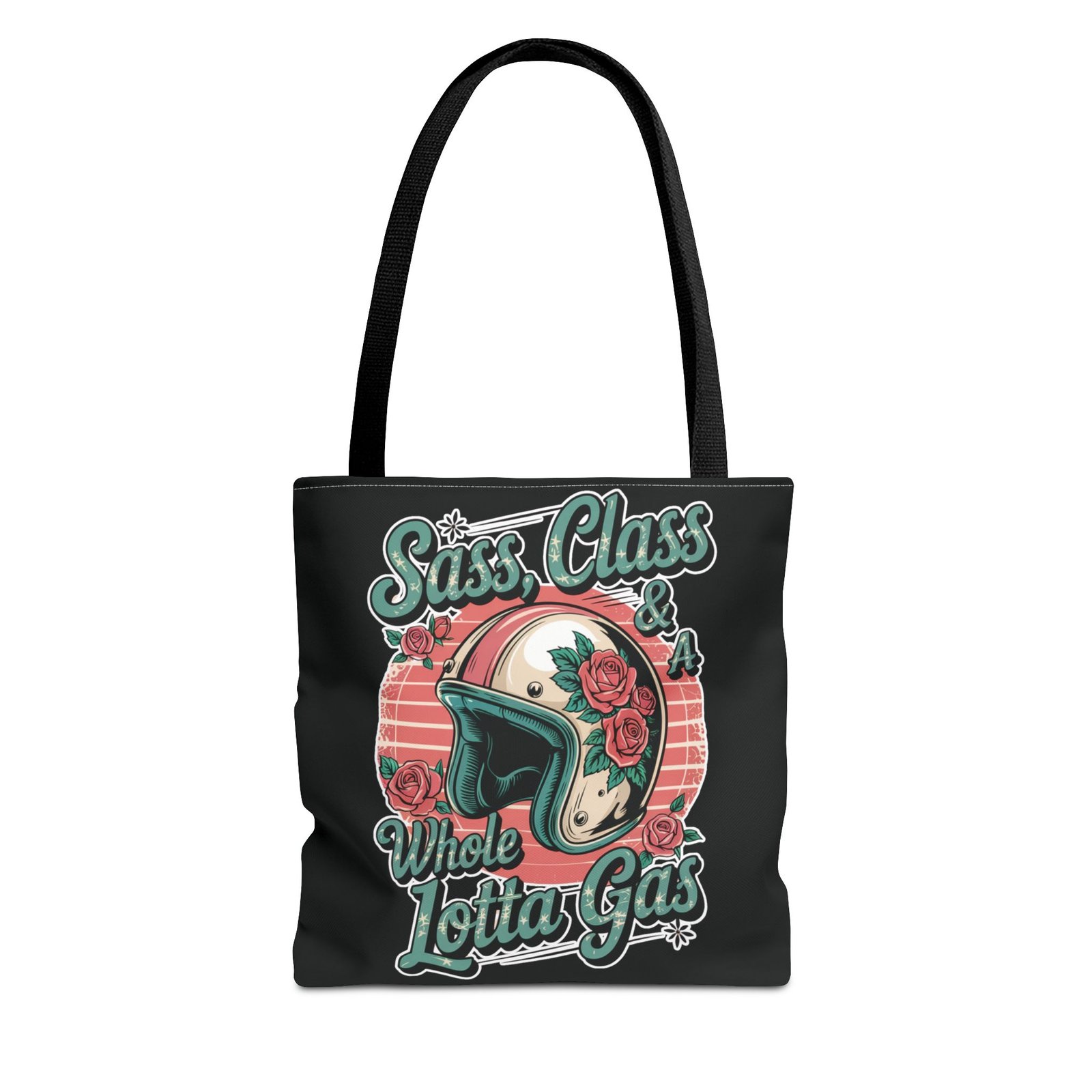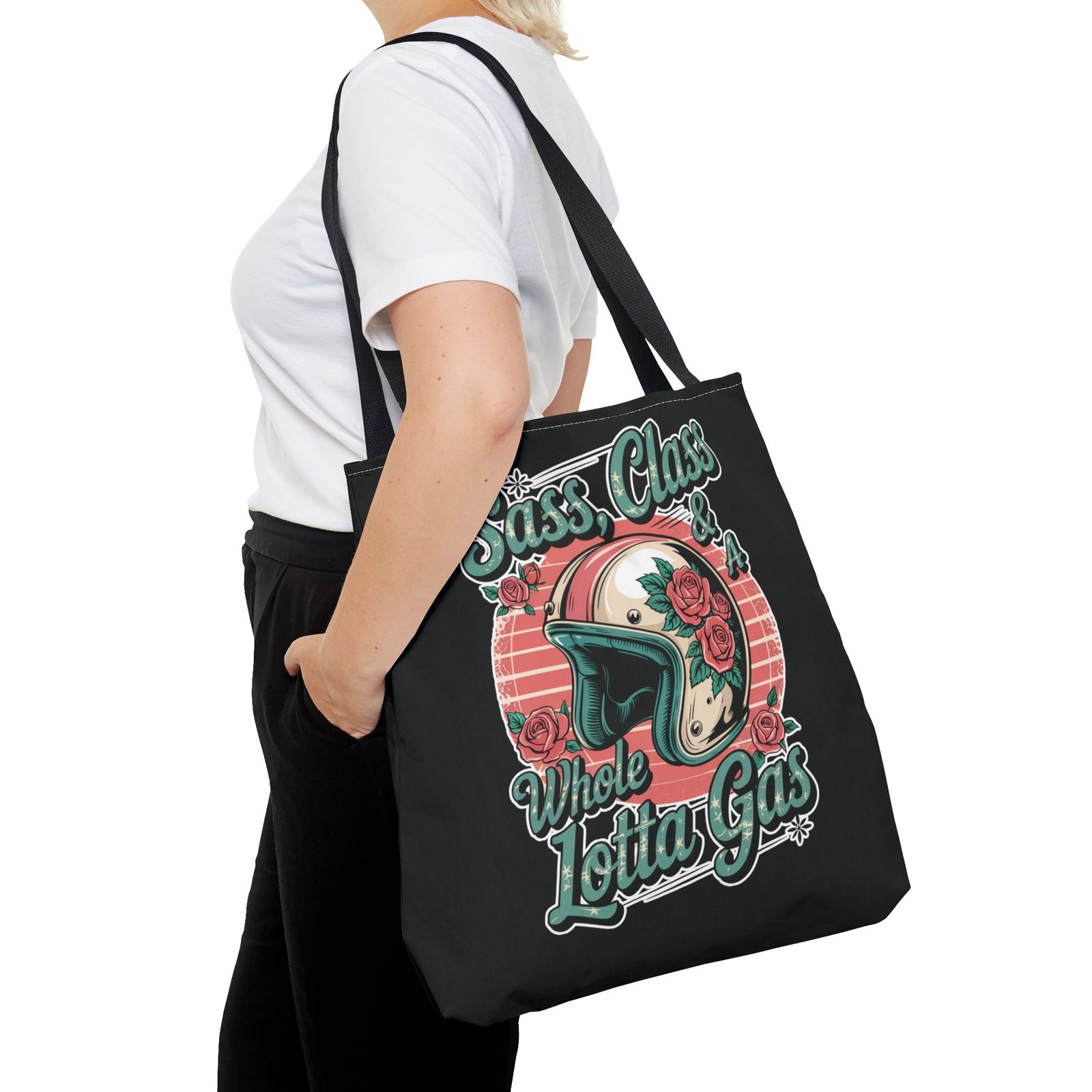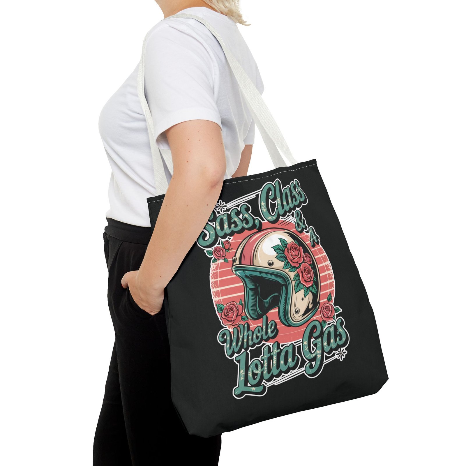 Biker Chick Tote Bag – Sass Class & a Whole Lotta Gas – Helmet Roses – Motorcycle.