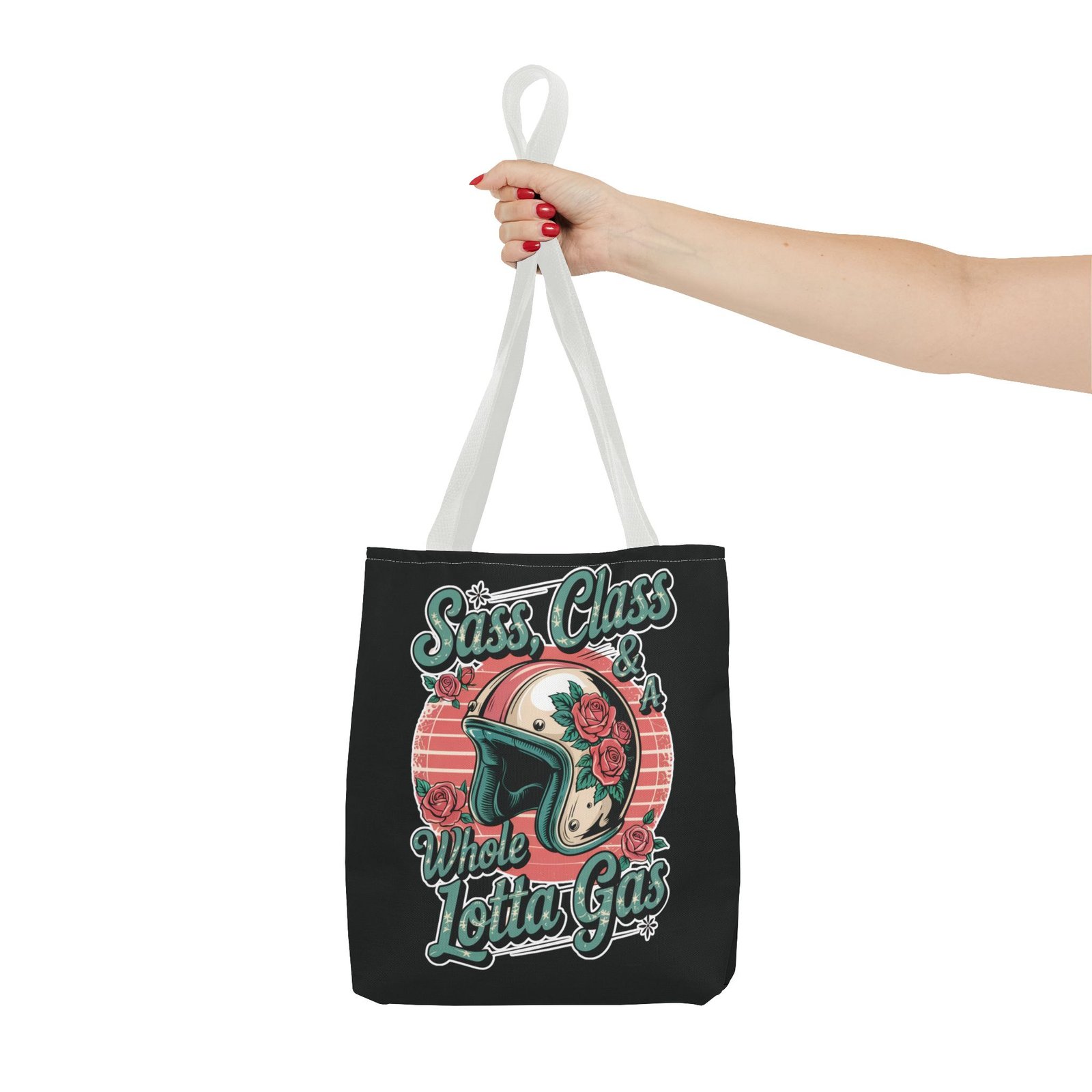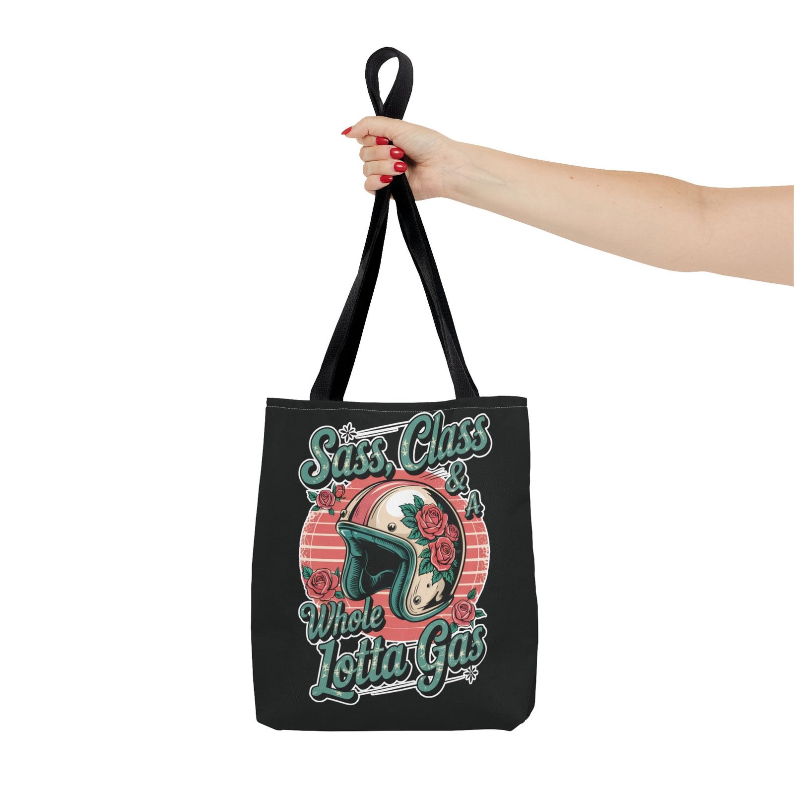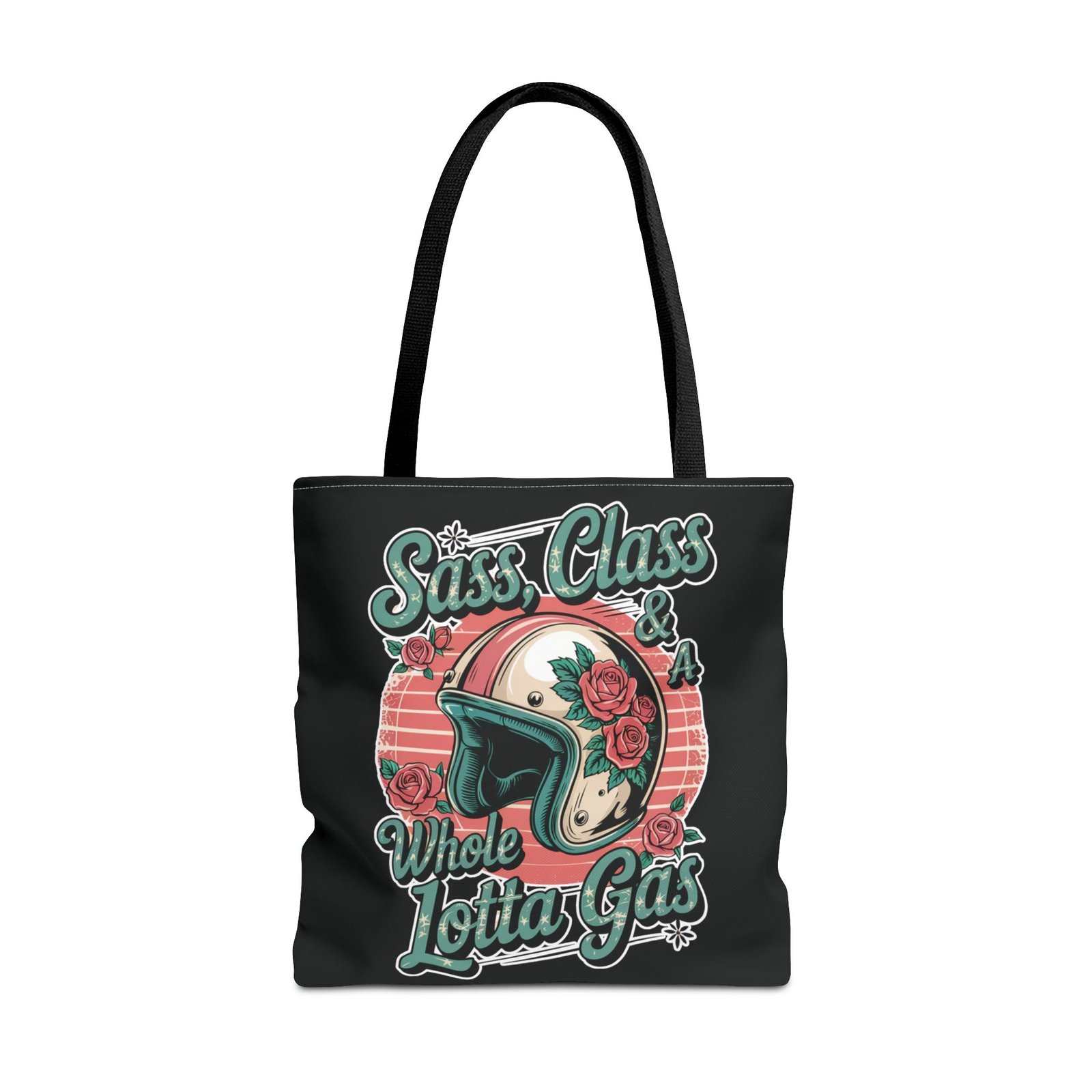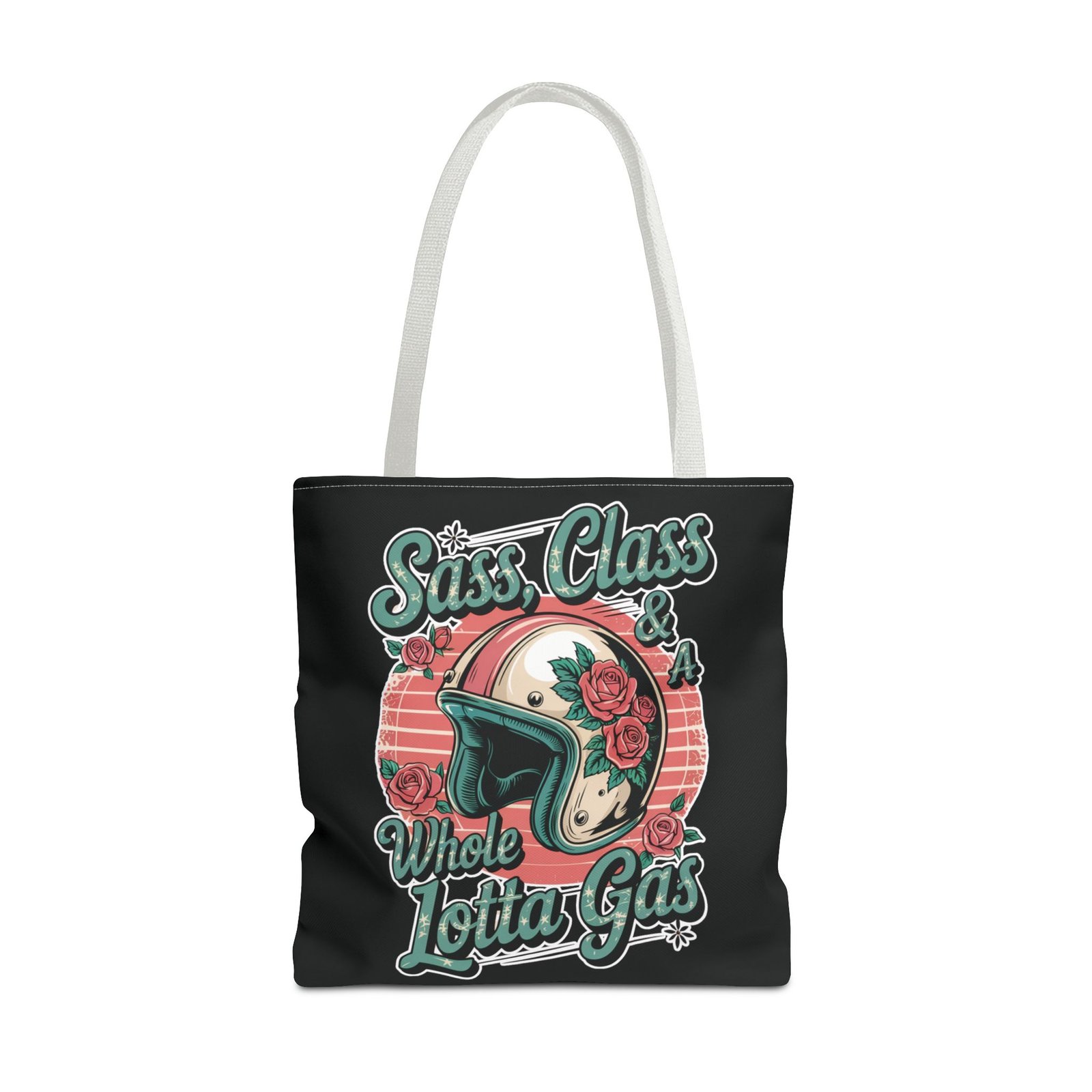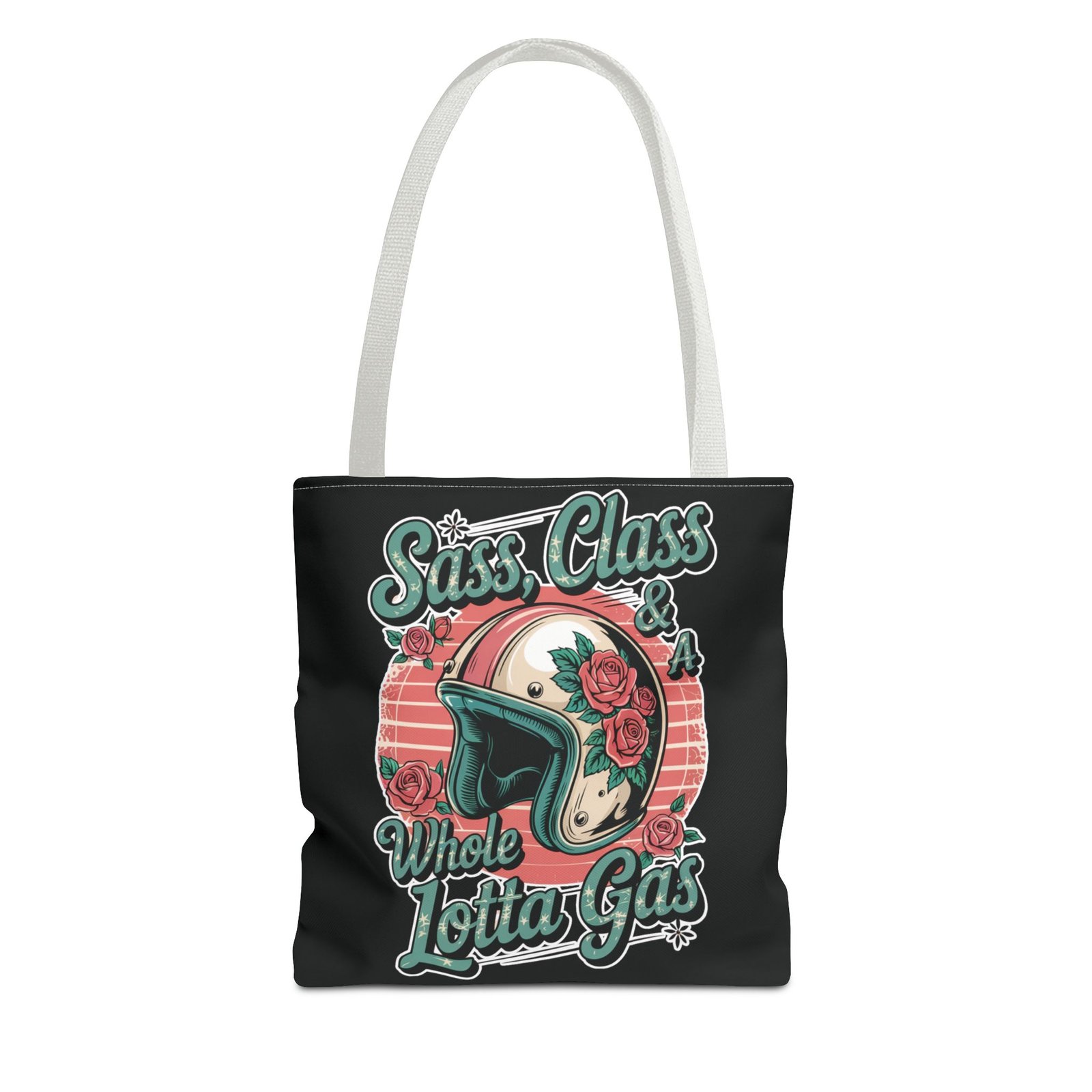 Biker Chick Tote Bag – Sass Class & a Whole Lotta Gas – Helmet Roses – Motorcycle.