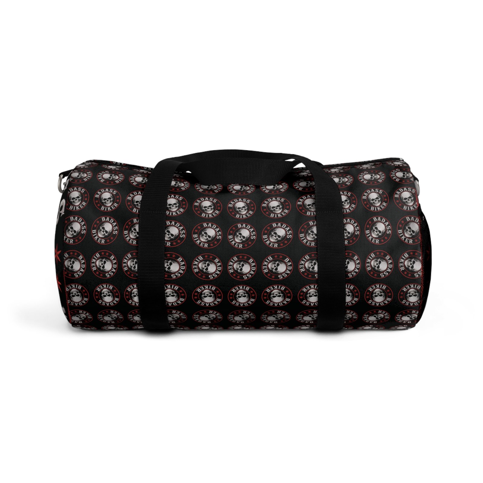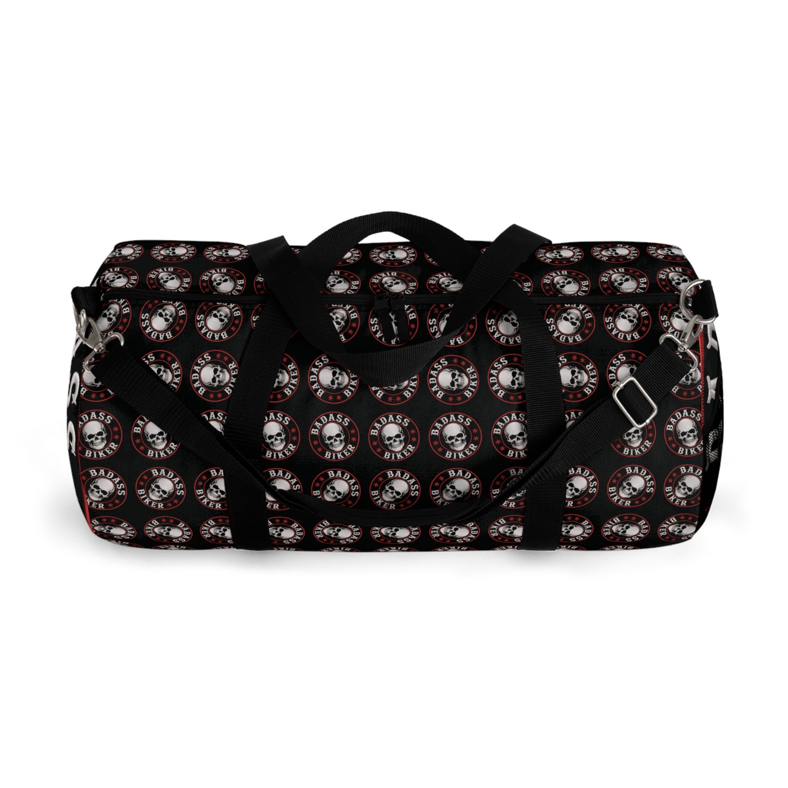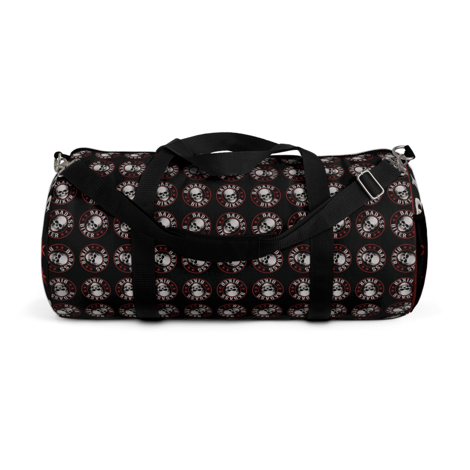 This roomy duffel carries the grit of late night drives and the quiet ritual of packing for a weekend away. The patch has an embroidered look, but it is a print only, there is no texture. The patch design is round, it’s in black, red, and white. The text on the patch print is “BADASS BIKER”. Black background. One large patch print on each end and an all over pattern on the rest of the bag. The dark, repeating biker patch motif reads moody and considered – the kind of pattern that blends with worn-in denim, leather boots, and a restless motorcycle traveler’s instincts. Stash a change of clothes, trainers, and a paperback in the main compartment, tuck smaller valuables into the internal zip pocket, sling it over your shoulder with the padded strap, and head toward whatever comes next. Durable Oxford polyester and solid hardware mean it can handle bus rides, gym floors, and overhead bins without complaint. It’s built for people who move often and pack thoughtfully.