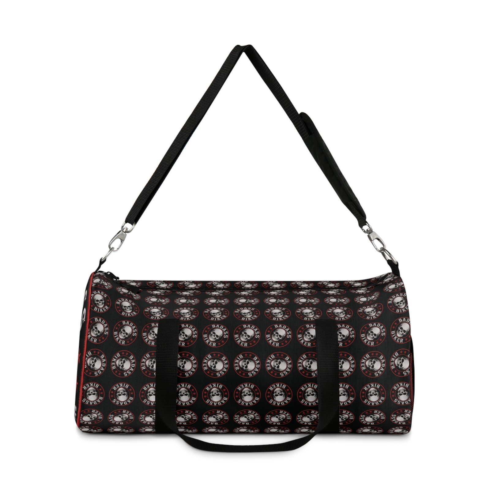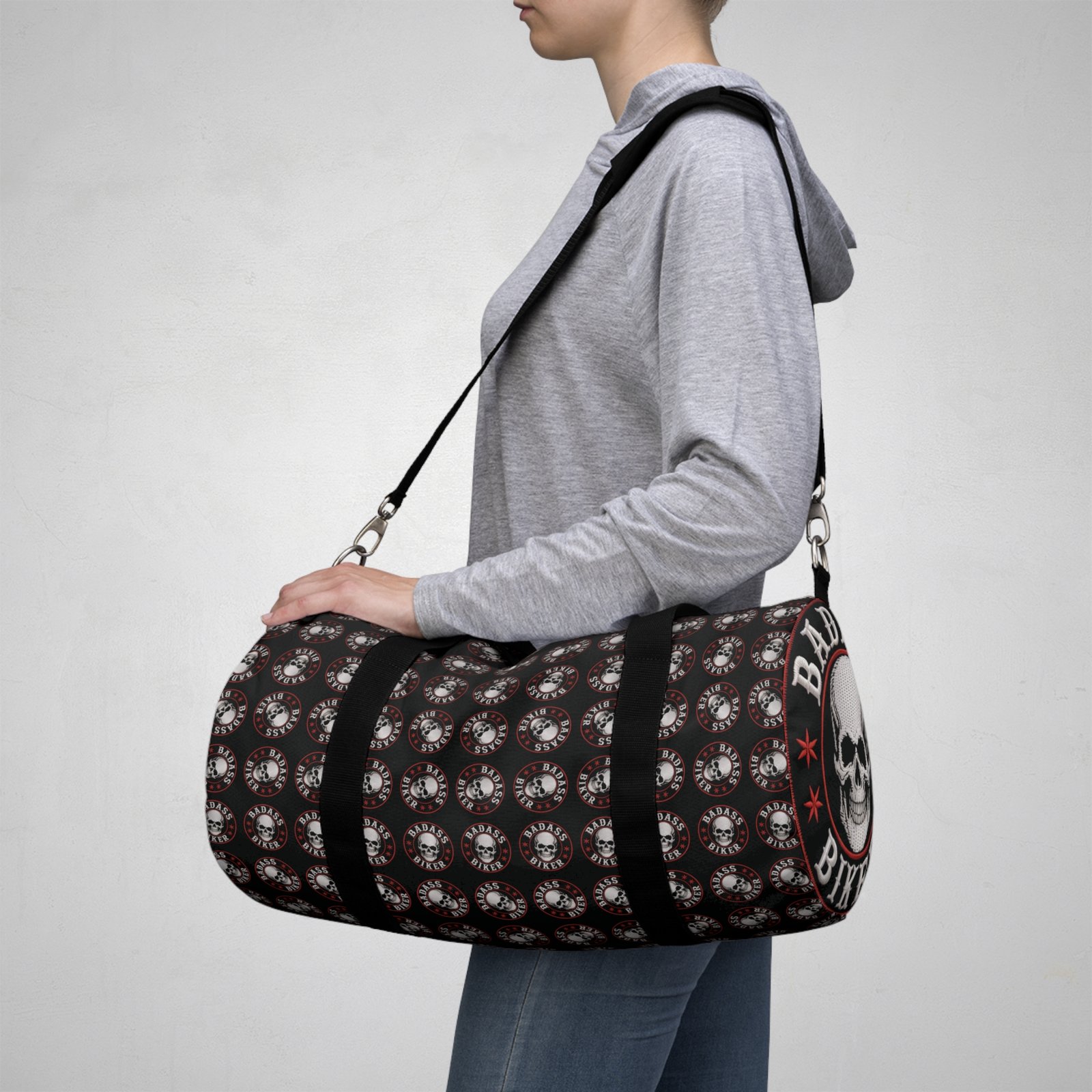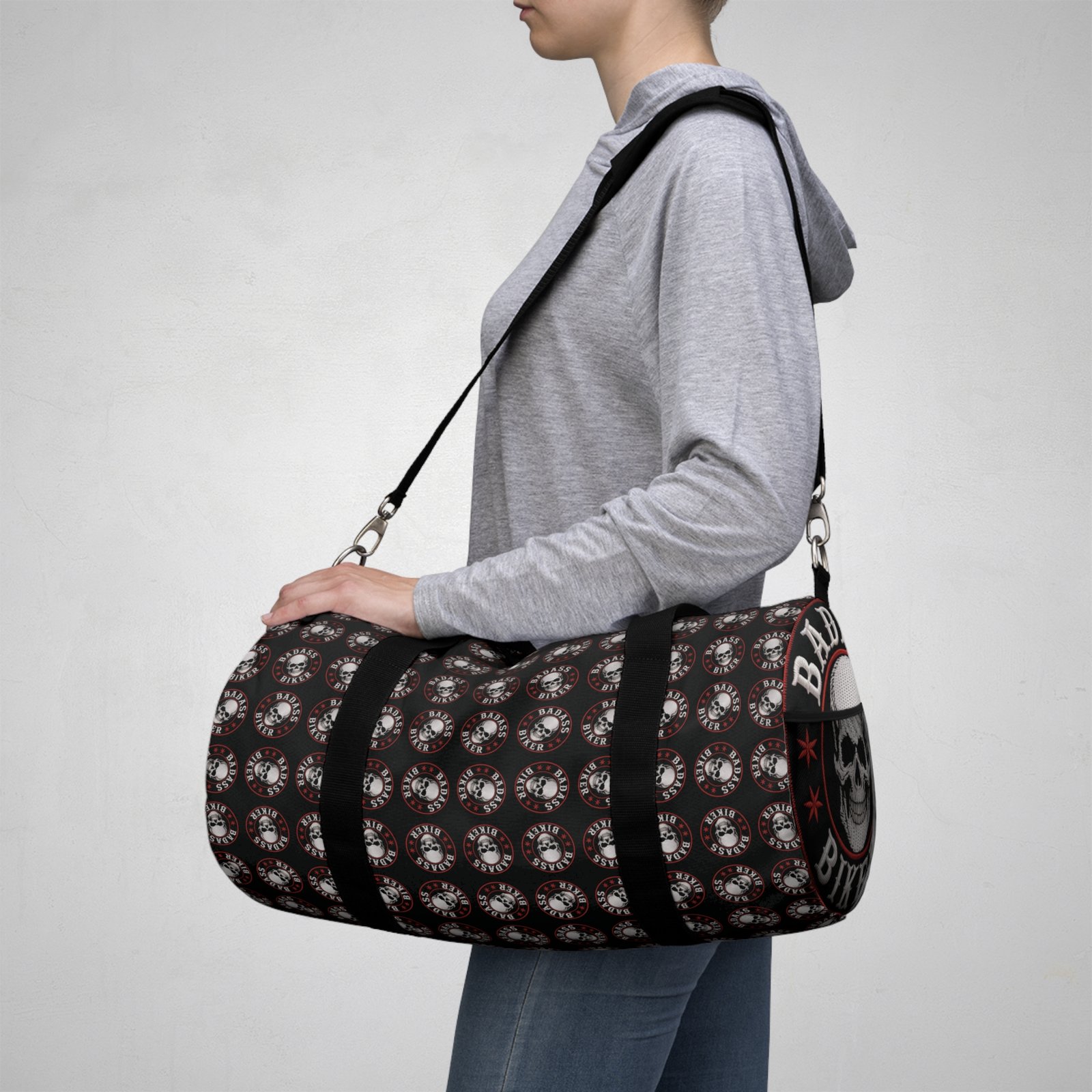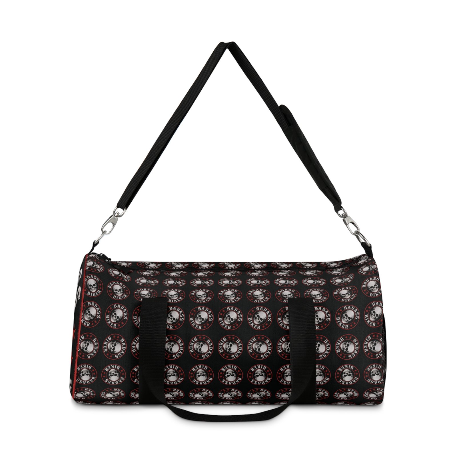 This roomy duffel carries the grit of late night drives and the quiet ritual of packing for a weekend away. The patch has an embroidered look, but it is a print only, there is no texture. The patch design is round, it’s in black, red, and white. The text on the patch print is “BADASS BIKER”. Black background. One large patch print on each end and an all over pattern on the rest of the bag. The dark, repeating biker patch motif reads moody and considered – the kind of pattern that blends with worn-in denim, leather boots, and a restless motorcycle traveler’s instincts. Stash a change of clothes, trainers, and a paperback in the main compartment, tuck smaller valuables into the internal zip pocket, sling it over your shoulder with the padded strap, and head toward whatever comes next. Durable Oxford polyester and solid hardware mean it can handle bus rides, gym floors, and overhead bins without complaint. It’s built for people who move often and pack thoughtfully.