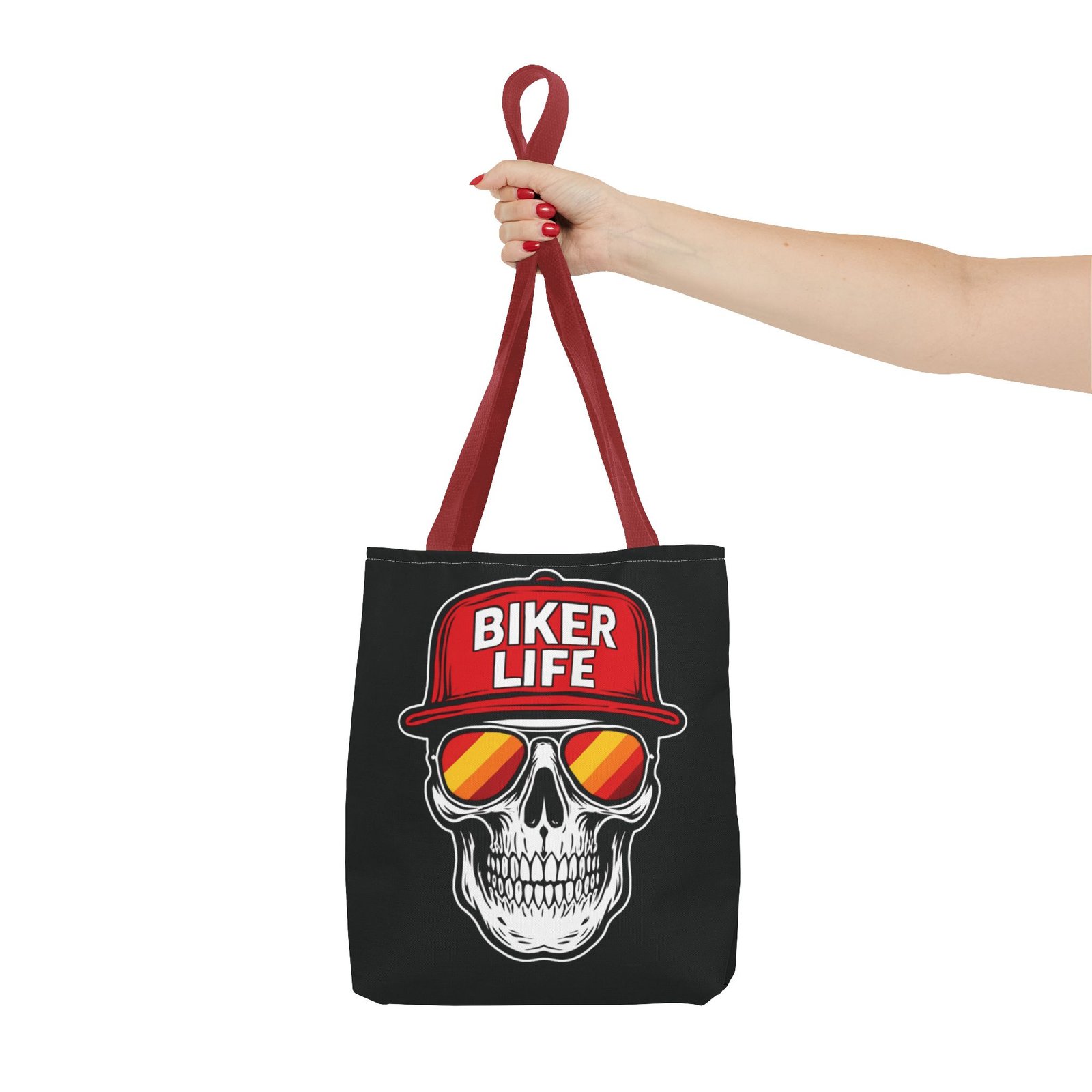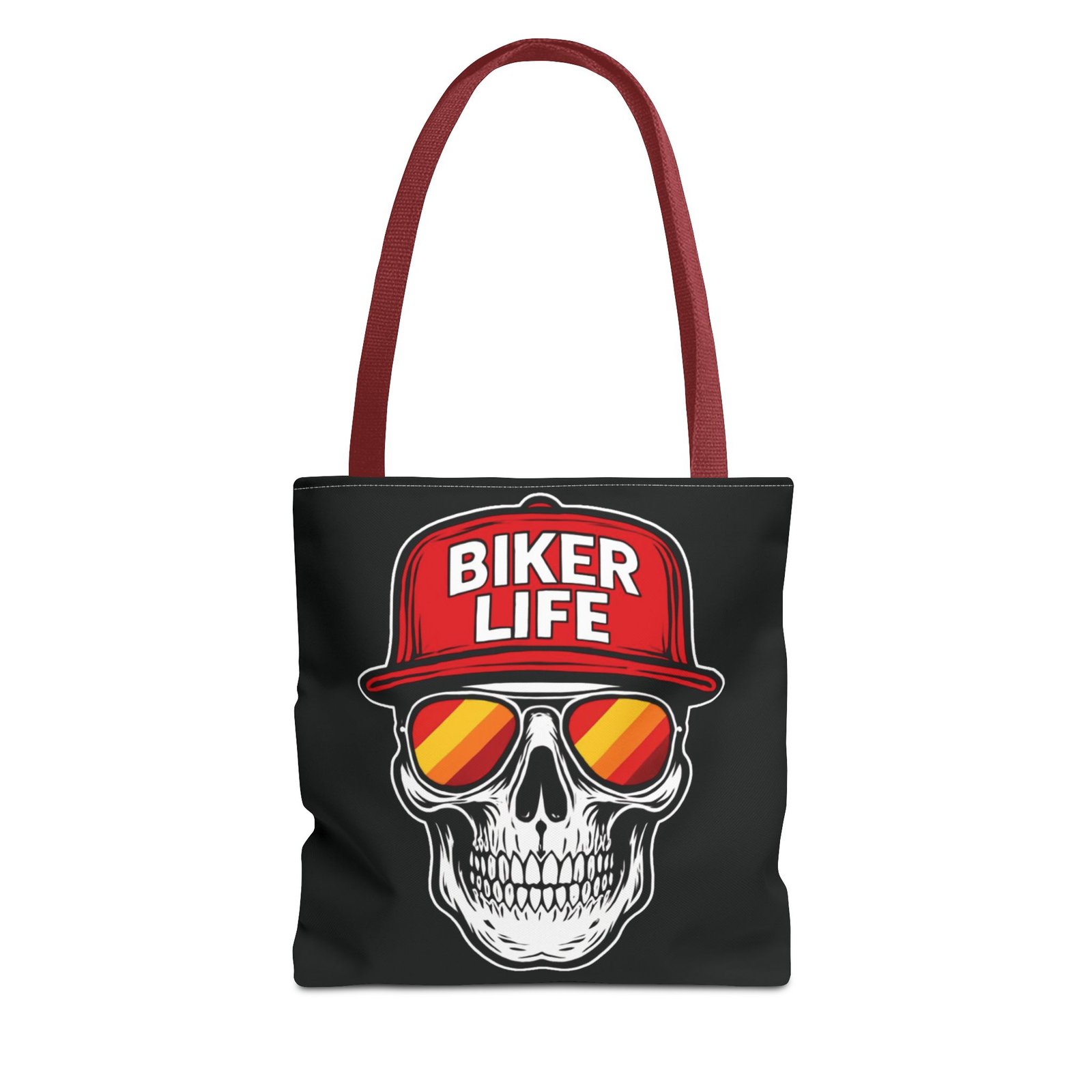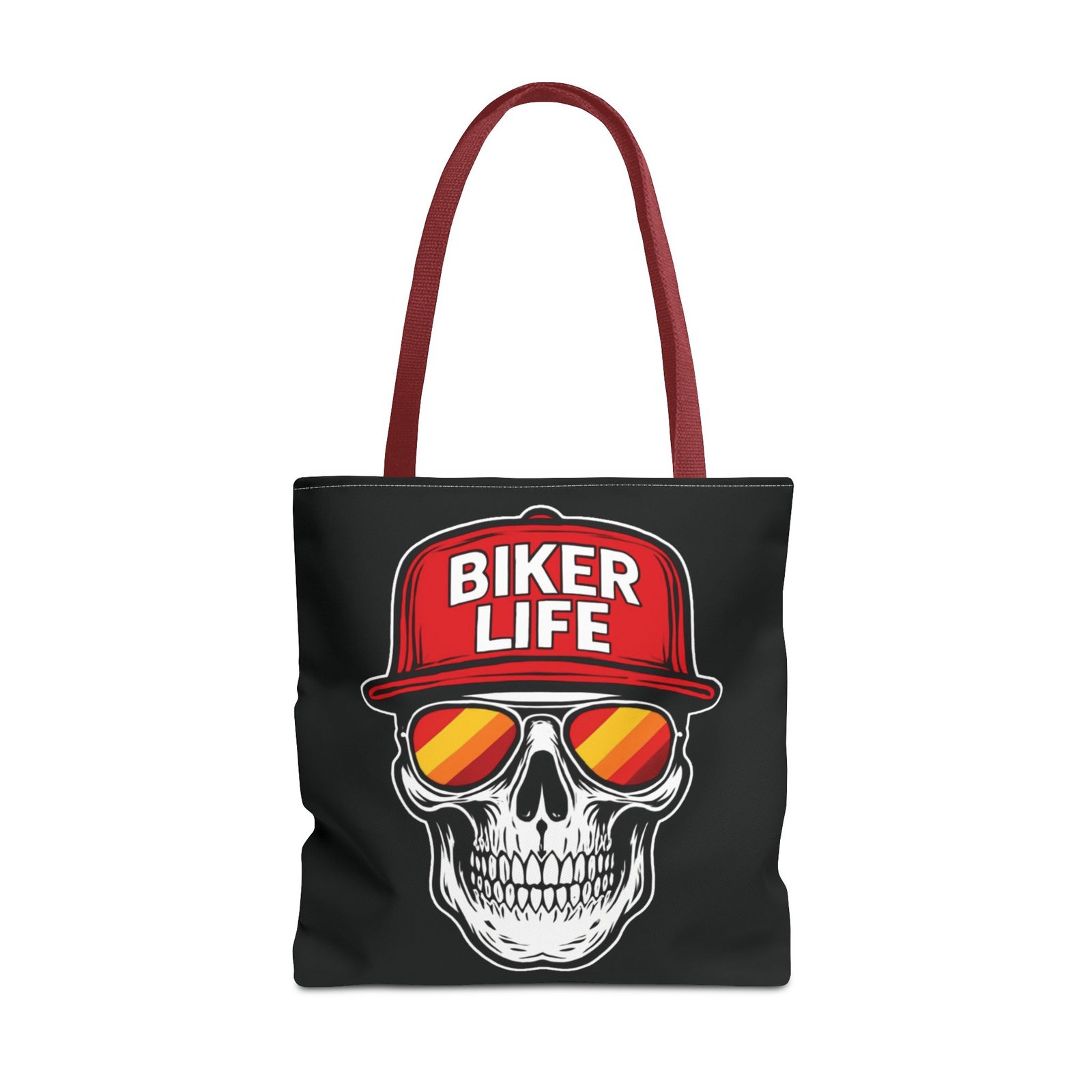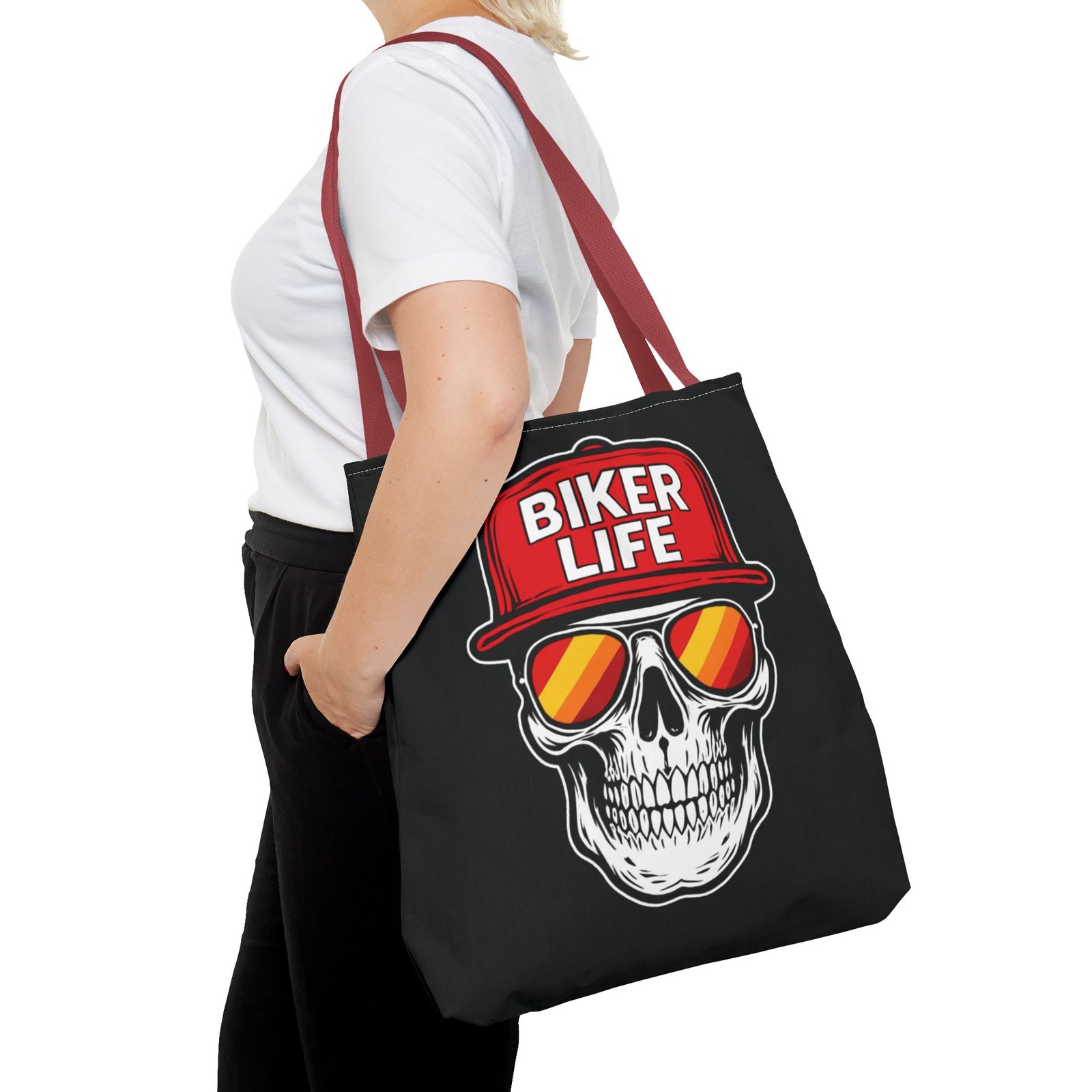 DESIGN: A tote bag featuring a skull wearing a snapback cap with the text, “BIKER LIFE” in white on a red cap. Super cool biker skull style. The design is on both sides. Color palette is black, red, orange, yellow, and white on your choice of handle color. Just plain fun for anyone who loves this biker lifestyle. Ideal for casual wear, motorcycle events, Father’s Day, Mother’s Day, and birthdays. We hope you love it!