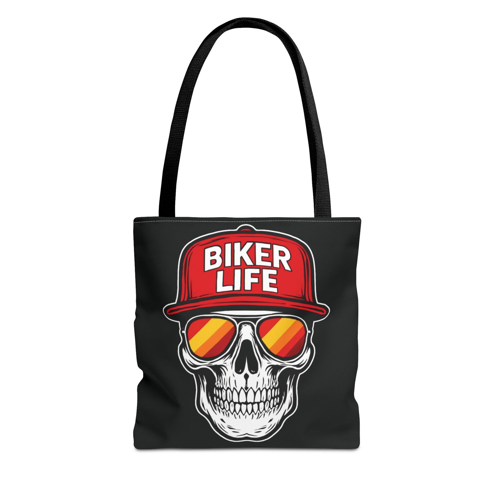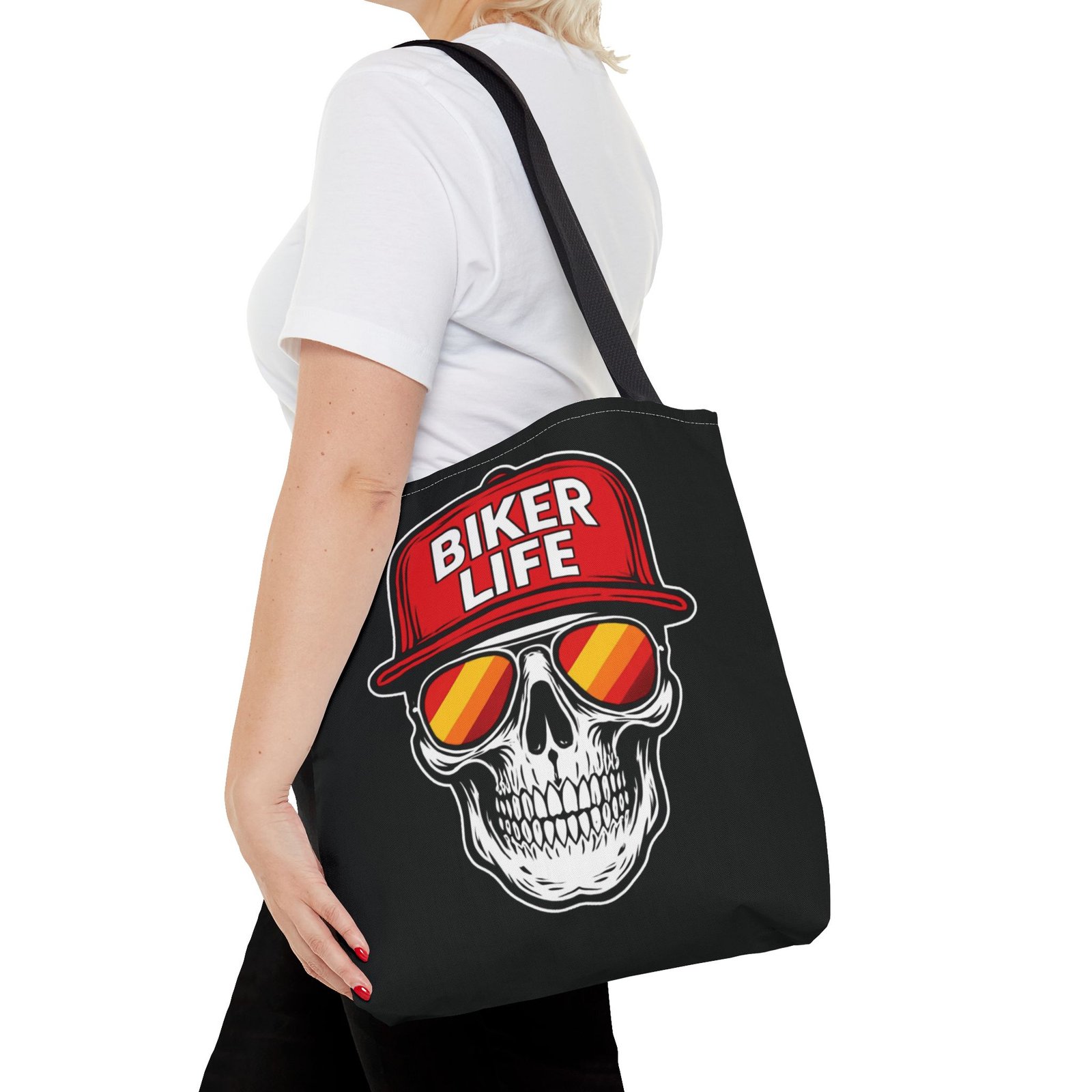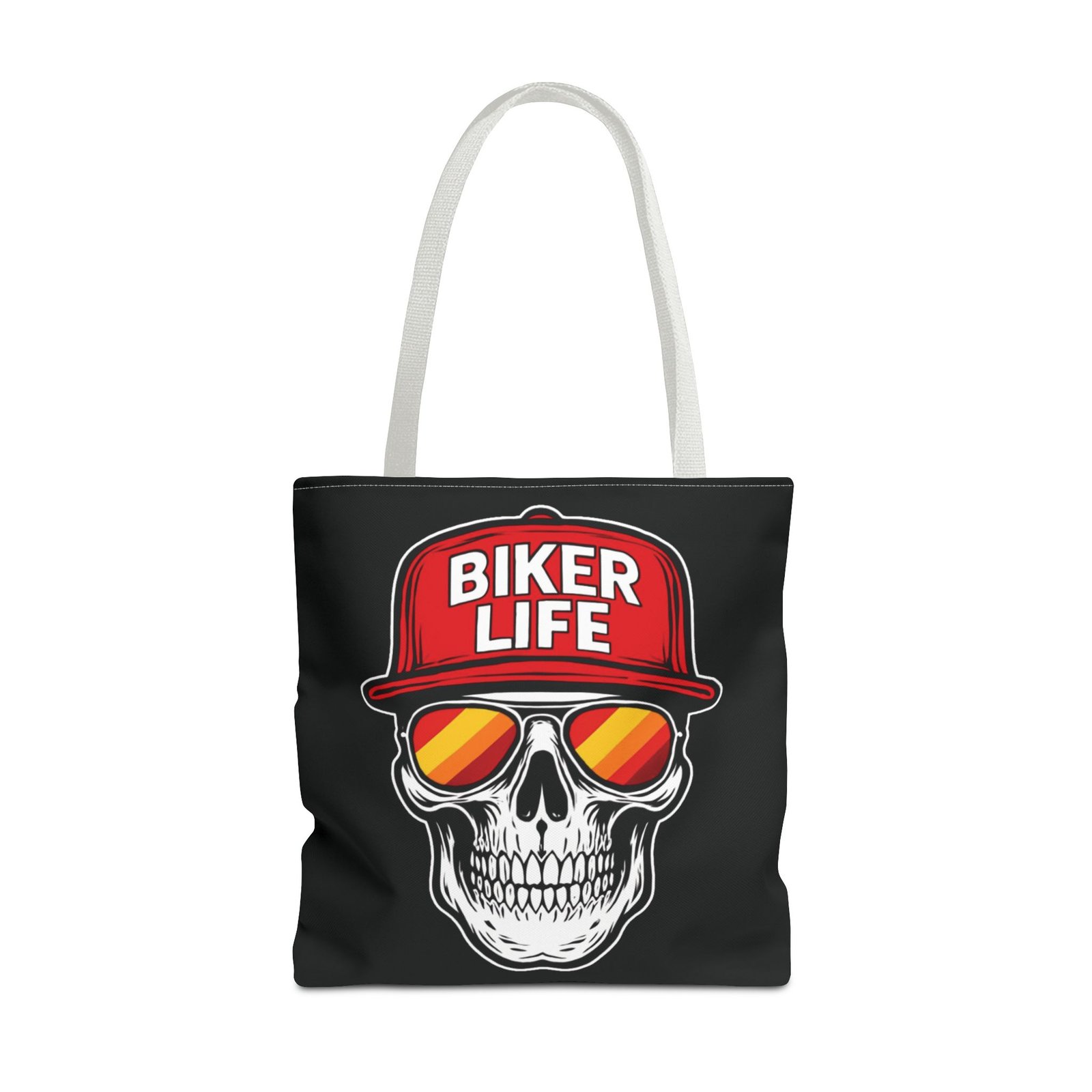 DESIGN: A tote bag featuring a skull wearing a snapback cap with the text, “BIKER LIFE” in white on a red cap. Super cool biker skull style. The design is on both sides. Color palette is black, red, orange, yellow, and white on your choice of handle color. Just plain fun for anyone who loves this biker lifestyle. Ideal for casual wear, motorcycle events, Father’s Day, Mother’s Day, and birthdays. We hope you love it!