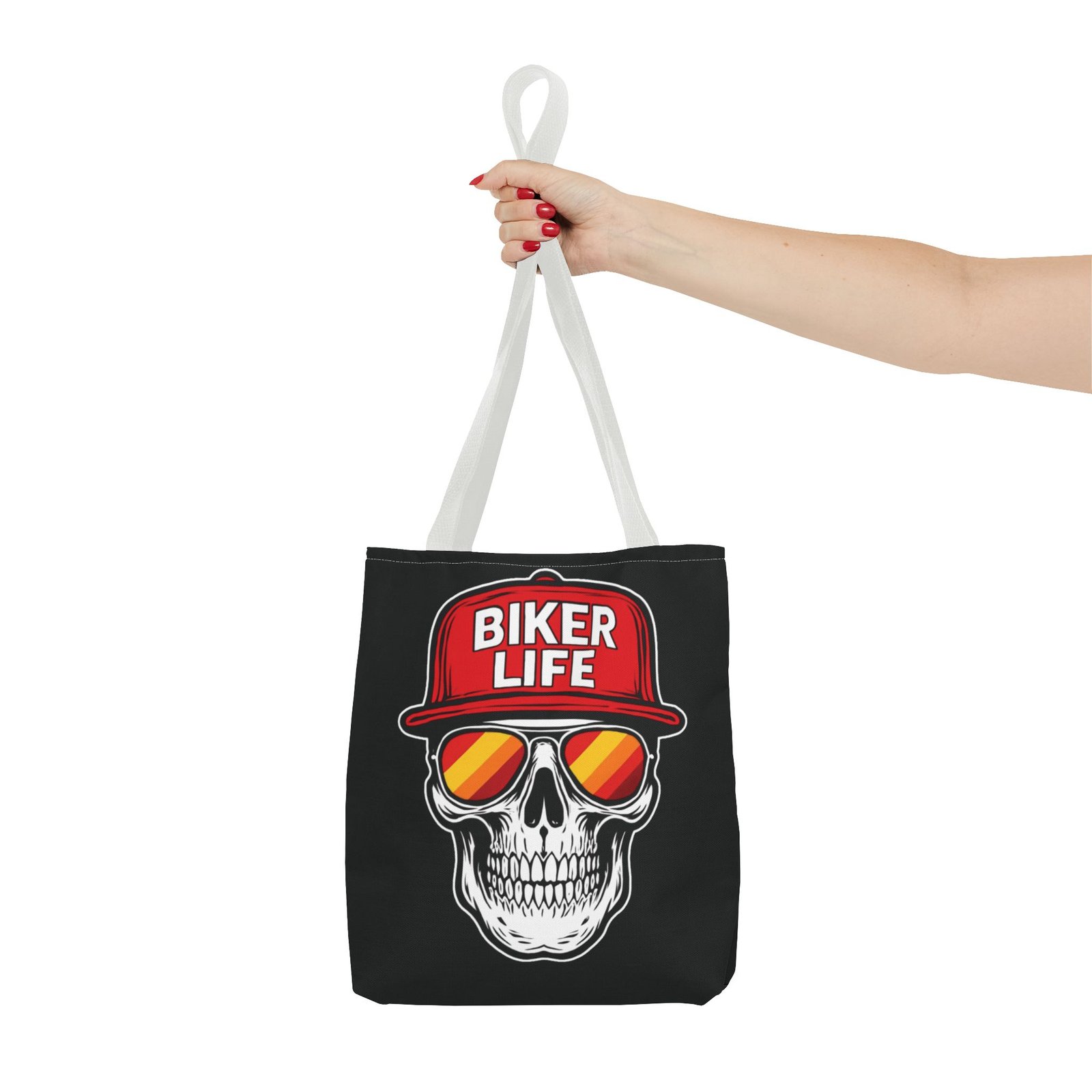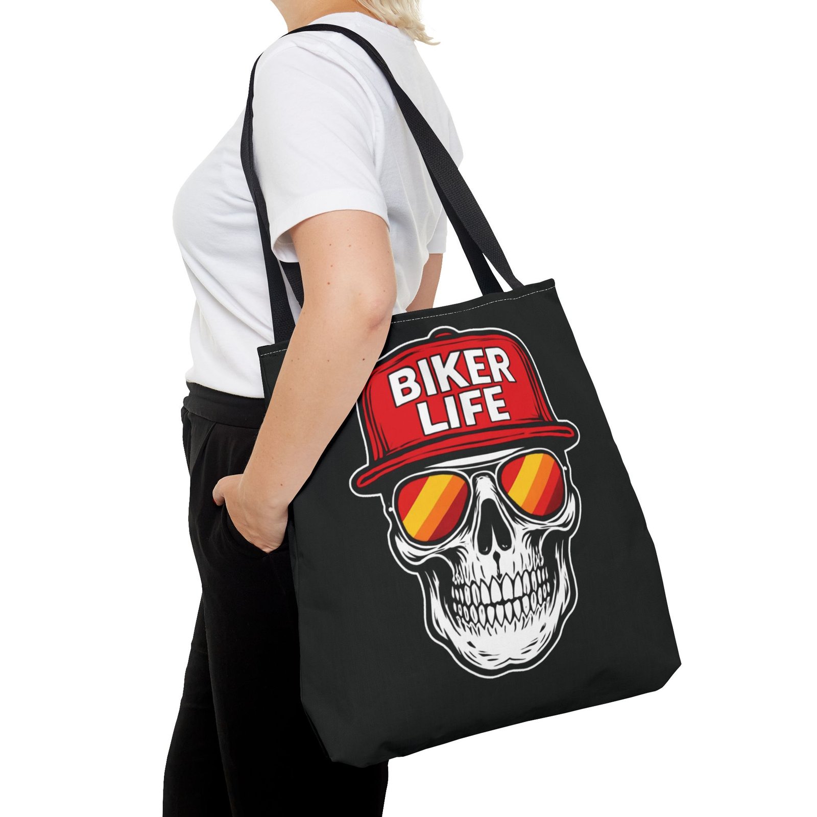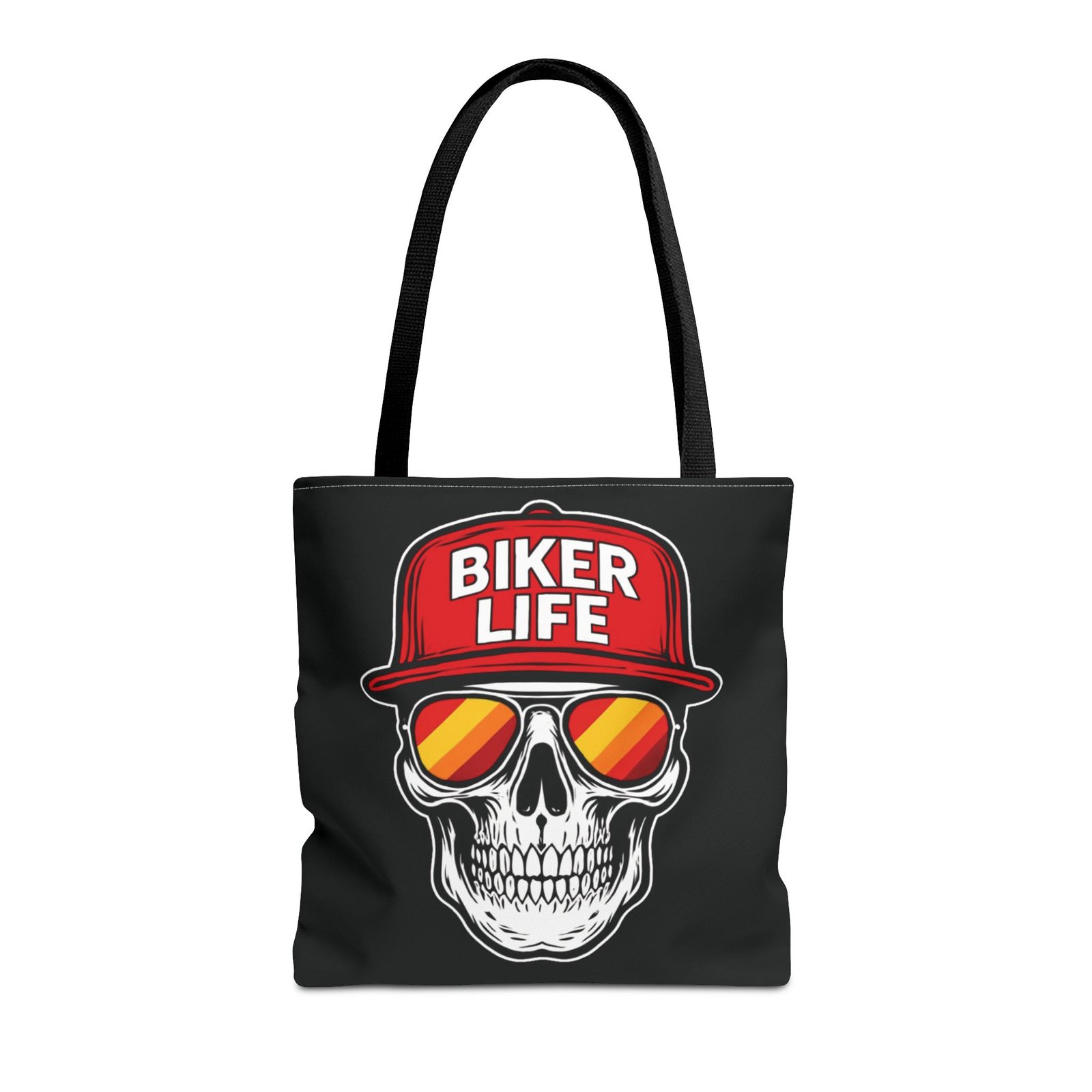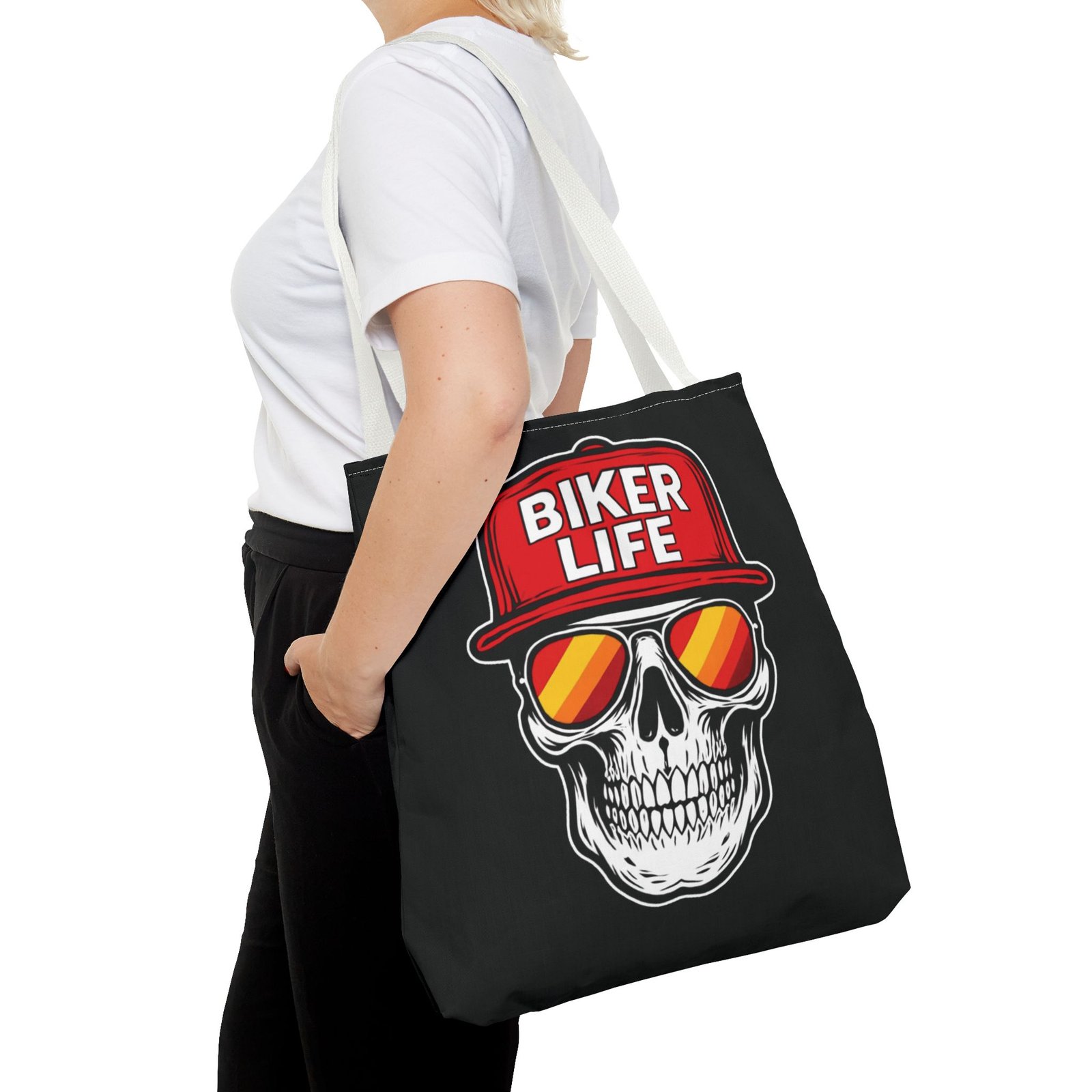DESIGN: A tote bag featuring a skull wearing a snapback cap with the text, “BIKER LIFE” in white on a red cap. Super cool biker skull style. The design is on both sides. Color palette is black, red, orange, yellow, and white on your choice of handle color. Just plain fun for anyone who loves this biker lifestyle. Ideal for casual wear, motorcycle events, Father’s Day, Mother’s Day, and birthdays. We hope you love it!